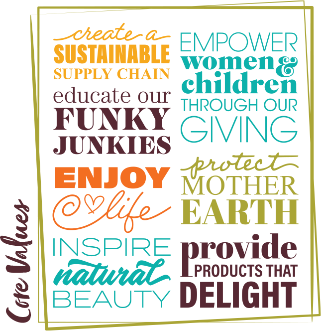 We will support women, men and children in their quest to confidently showcase their beauty...NATURALLY. We will provide a system of high quality, affordable beauty solutions globally that address the needs of the diverse world, while helping to protect the earth’s valuable resources. Our community will be uplifted through charitable initiatives, and we will inspire our team members to bring their best selves each day.